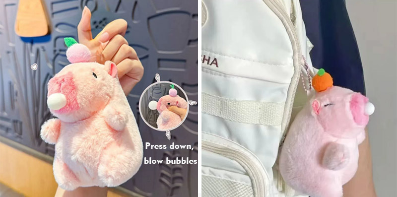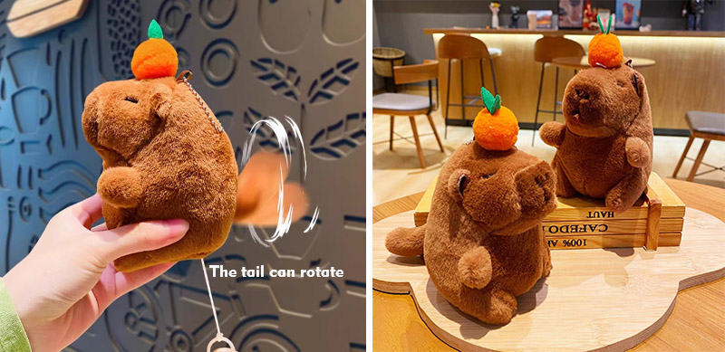Mit Capybara als Kerndesign zeigt das Bild die Plüschform von Capybara. Dieses Plüschmaterial kann das Erscheinungsbild der Capybara besser darstellen, und das Gesamtbild ist extrem bezaubernd. Capybara ist in zwei verschiedenen Farben erhältlich, nämlich rosa und braun. Auf ihren Köpfen befinden sich verschiedene Früchte wie Persimons, Pfirsiche und Äpfel, und ihre Augen schützen sich. Dieser Capybara -Plüsch -Schlüsselbund hat auch eine interaktive Funktion. Solange Sie das Seil ziehen, kann sich sein Schwanz drehen. Wenn Sie sein Gesicht kneifen, kann es Blasen blasen, und wenn Sie Blasen blasen, kann es sogar Geräusche machen. Die einzigartigen Fähigkeiten können Kunden effektiver anziehen und ihre Gunst gewinnen.